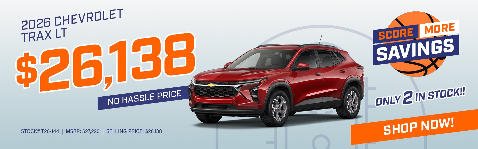 Stock # T26-144, 2026 Trax LT. Image is for illustrative purposes only. MSRP: $27,220; -$500 GM Customer Cash; -$582 Dealer Discounts = Selling Price: $26,138. Not available with special financing, lease and some other offers. See participating dealer for details. Must take new retail delivery by 03/31/2026.
